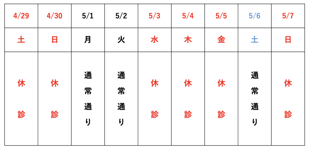 ゴールデンウィークの診療は以下の通りとなります。