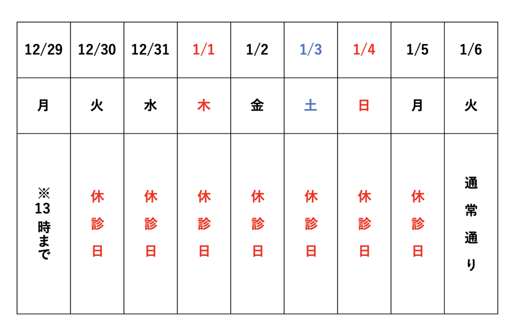 年末年始の休診中は電話連絡、メールの対応ができませんのでご注意ください。メールについては1月6日より順次返信していきますのでそれまでお待ちください。